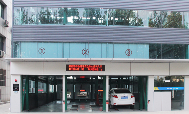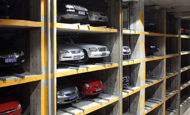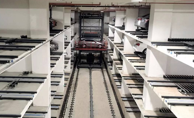 在兩側(cè)泊位的中央設(shè)有巷道堆垛機(jī),整個(gè)車庫的運(yùn)行均由堆垛機(jī)和搬運(yùn)器來完成。汽車入庫時(shí),汽車停在出入庫臺上,堆垛機(jī)從出入庫臺上取走汽車后在巷道內(nèi)行走并提升,將汽車運(yùn)送到指定層的泊位旁,堆垛上的搬運(yùn)器將汽車從堆垛機(jī)送入泊位,堆垛機(jī)利用先進(jìn)技術(shù)無縫整合了升降和行走兩套系統(tǒng),并配備變頻控制系統(tǒng),采用激光測距來行走定位,采用光通訊無線信號傳送,實(shí)現(xiàn)邊行走邊升降的功能以達(dá)到節(jié)約時(shí)間、降低能耗和空間利用最大化的目的。